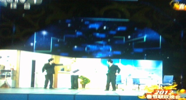 10.45pm – The baby’s woken up again. Lots of fireworks outside now, but there’ll be much more after midnight. We’re back on CCTV1 now, and there’s an office-based sketch with the bald comedian who wears hooded sweatshirts.