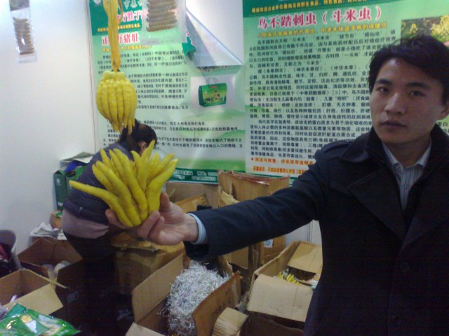 On our way toward the exit we come across a stall selling a strangely shaped yellow fruit. “Does it taste good?” “No, but you can make a healthy tea with it.” I’ve heard that one before. Anyone have any idea what the hell this is?