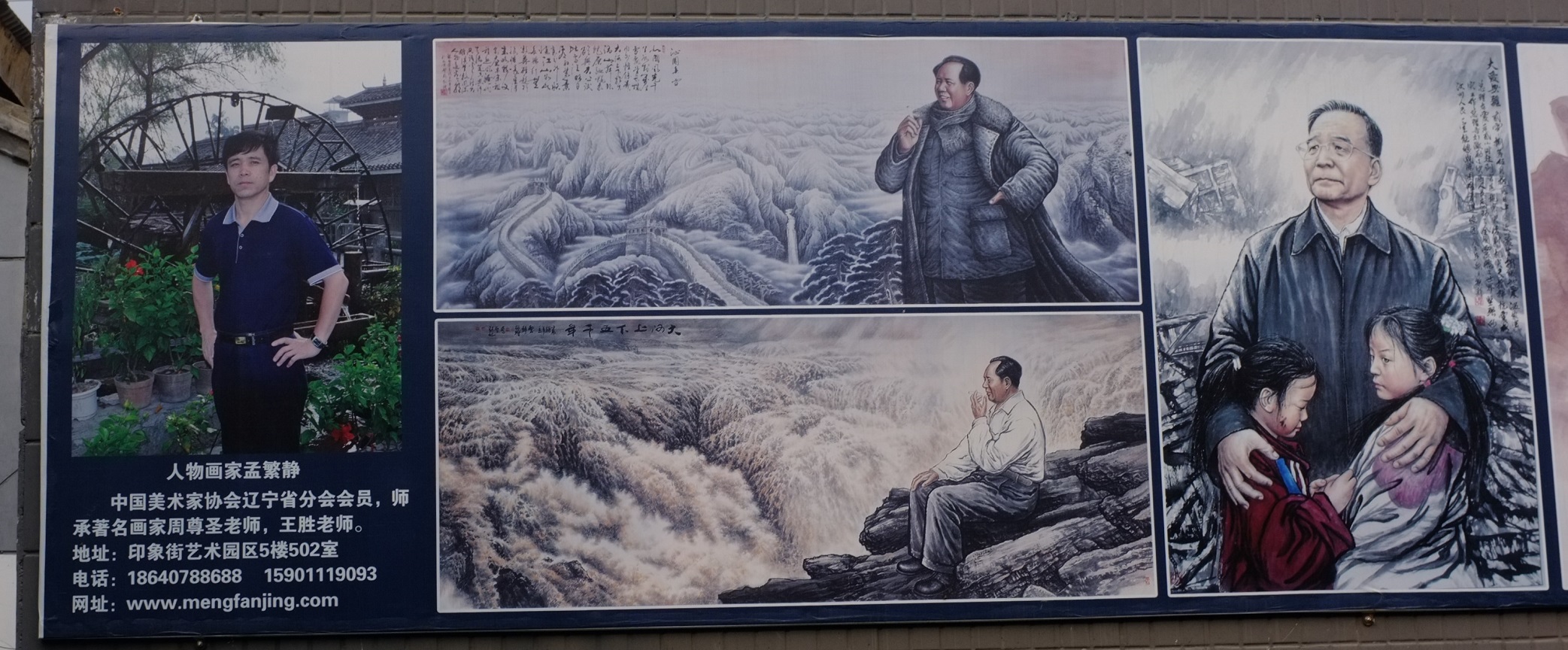 At the start of summer, on a miserable drizzly day, we went to check out the artists community at Songzhuang, just down the road, and came back with nothing apart from a doggy bag full of Dongbei food. This is the only photo worth sharing – an advertisement for an apparently fiercely patriotic artist who paints heroic scenes featuring Chinese leaders.