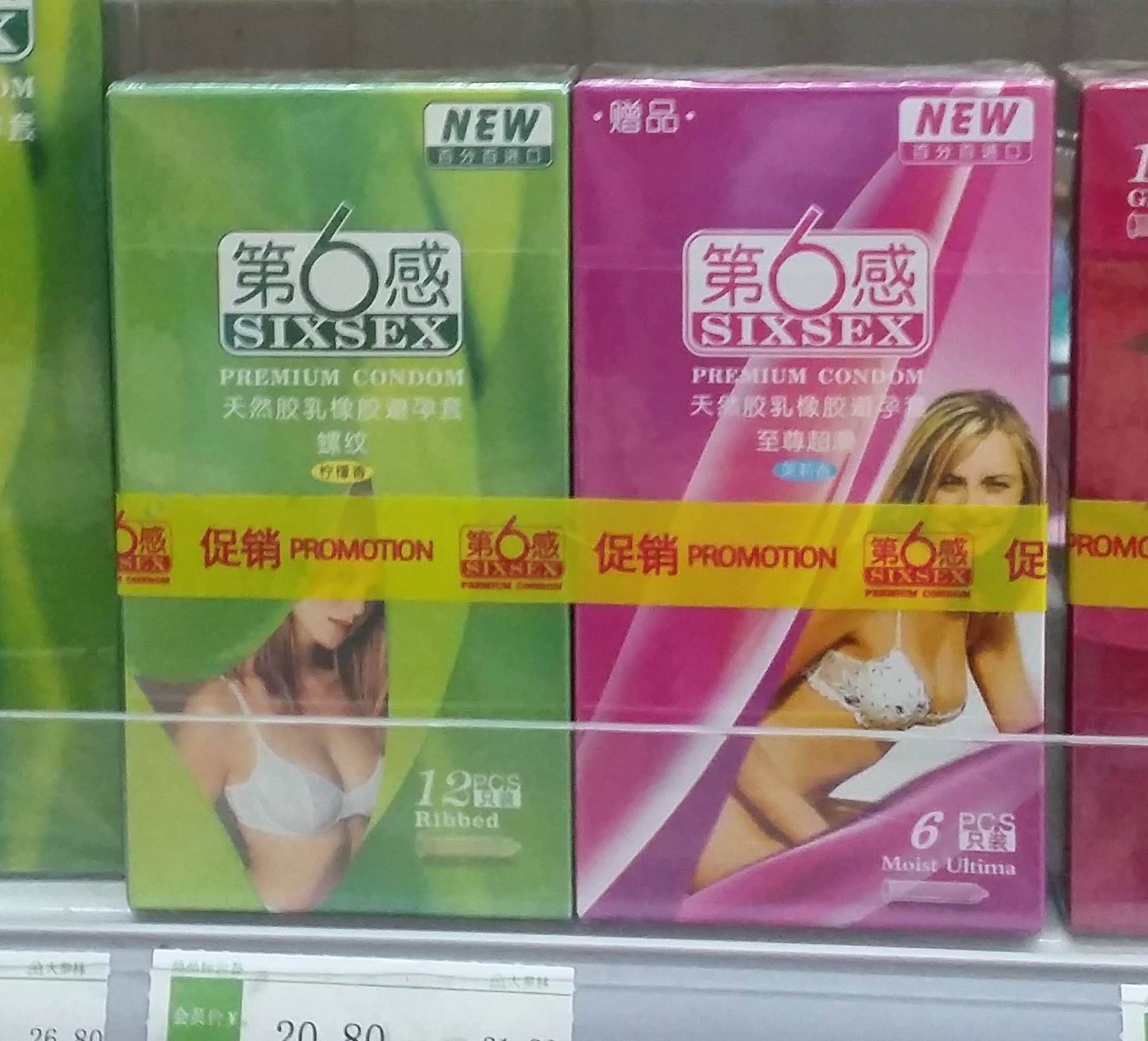 These are called “sixsex” – I assume this means there are six condoms in the packet, but the one on the left says 12, so now I don’t know what to think.